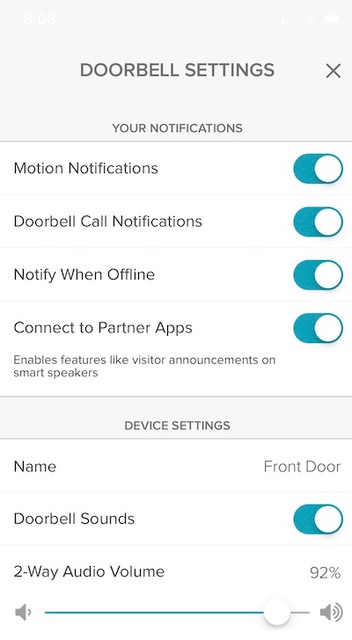 Within the App you can set up additional users, admin users, guests and adjust your notification settings among other options. Luke and I are both listed as owners, so we can add and remove guests as needed. You can specify the notifications you wish to get, motion, doorbell calls, adjust volume on two way calls and more. Additionally you can check on the strength of your wifi signal , change wifi networks if you have multiple and more.
