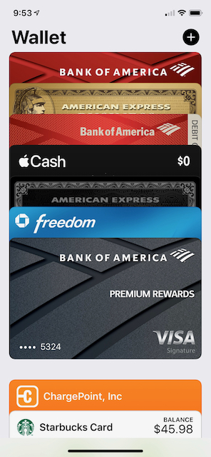 I have my ChargePoint card, Starbucks card, hotel room key and other stuff in my Wallet, too. Pretty soon now, Apple will be introducing the new Apple card with Goldman Sachs. This card has many new features, no fees and is designed from the start to be primarily a digital card, so you should get your Wallet set up if it is not already.