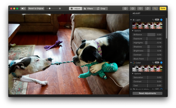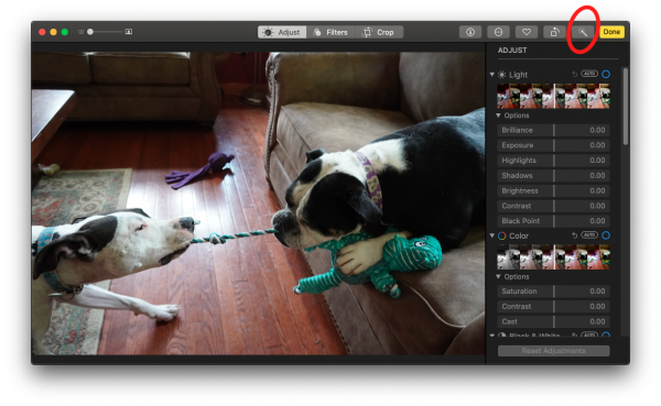In this photo of Java and Jezebel playing tug-a-waa you will see that the original is a bit dark and some of the highlights of the dogs faces are not so good. Clicking on the magic wand has fixed the picture by adjusting brilliance, exposure, highlights, shadows, brightness, contrast and black point automatically according to Apple’s built-in intelligence. Notice the difference in the sliders under the “light” heading. For many photos this is all you need to do.