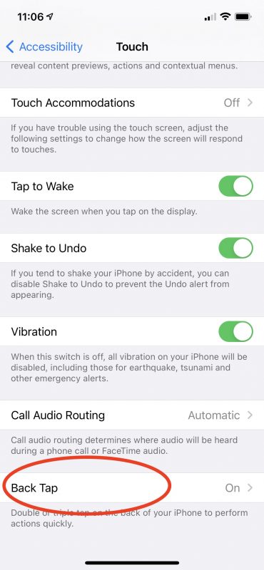 To activate back tap you must be running iOS 14 or higher on an iPhone 8 or later. Go to Settings ->Accessibility->Touch and tap Back Tap.