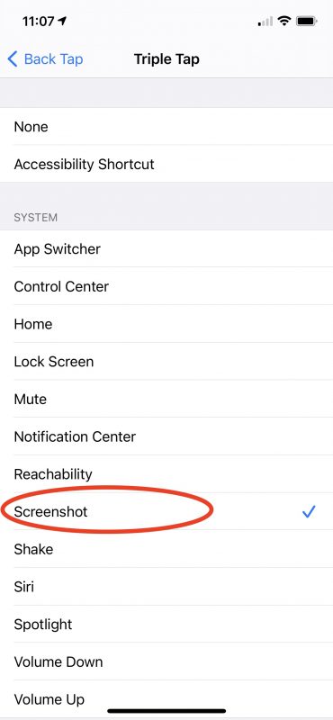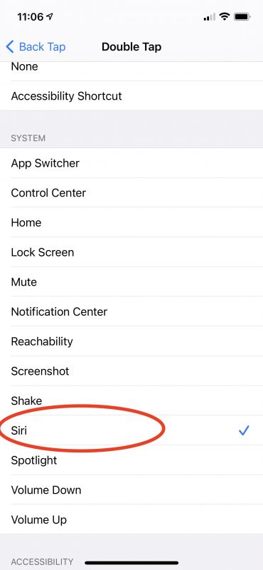 You can then choose either Double Tap or Triple Tap and whatever action you would like. I have chosen for the time being, a double tap to activate Siri and a triple tap to take a screen shot. But you have a big selection of actions ranging from mute, to Home Screen to control center and more. You can even use double or triple tap to trigger an Accessibility shortcut such as Magnifier or Voice Over.