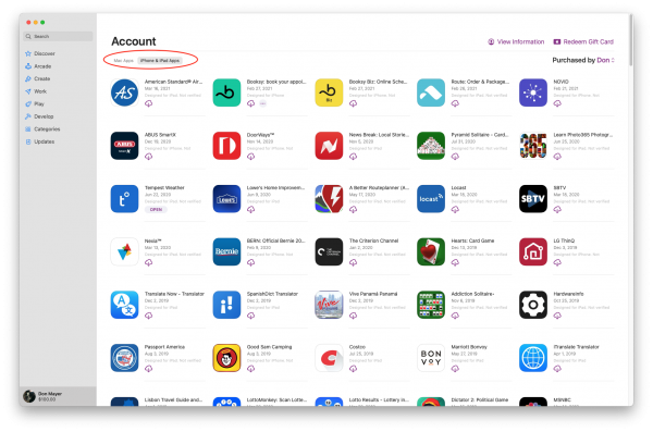 But there is a much easier way to find the apps that you may already have installed on your iPhone or iPad. Just select your profile from the lower-left corner of the Mac App Store and switch to the iPhone & iPad Apps tab to access it. From there, you can start installing the apps that you want.