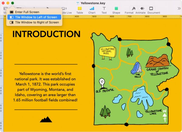 2. Choose Tile Window to Left of Screen or Tile Window to Right of Screen from the menu, and the window will fill that side of the screen. In past versions of MacOS (you need OS X El Capitan or later to use Split View), click and hold the green full-screen button, and drag the window to the left or right of the screen to tile it.