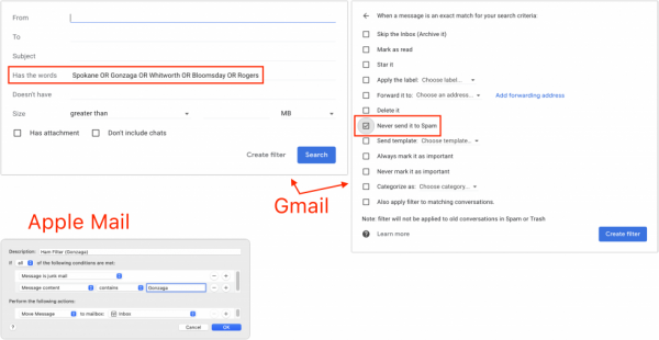 A ham filter looks for certain words—usually proper nouns—that are likely to appear only in legitimate messages and then marks such messages as Not Spam or moves them out of a Spam folder. (This capability is available in Gmail and can be emulated with multiple rules that you create in Apple’s Mail preferences, and likely in other systems as well; ask us about yours if you’re not sure.) Useful ham words include the name of your city, local high school or college names, club names or abbreviations, industry-specific terms, and any other words that are specific to your community or profession. Always test a possible ham word by first searching for it in your Spam folder to make sure it appears only in legitimate messages.