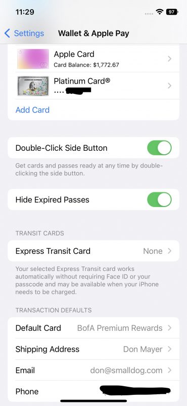 Here you can toggle the double-click on the side button to quickly bring up your default card to pay, hide passes that are expired and if you have an express transit card you can just pull out your phone and wave it at the terminal without waking up the phone.