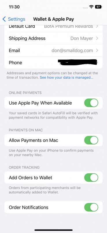 You can also toggle to use Apple Pay online when you are shopping at vendors that support Apple Pay and allow payments from your Mac, too. If your vendor is hip you can also add the orders to the Wallet and get notifications about the progress of your order.